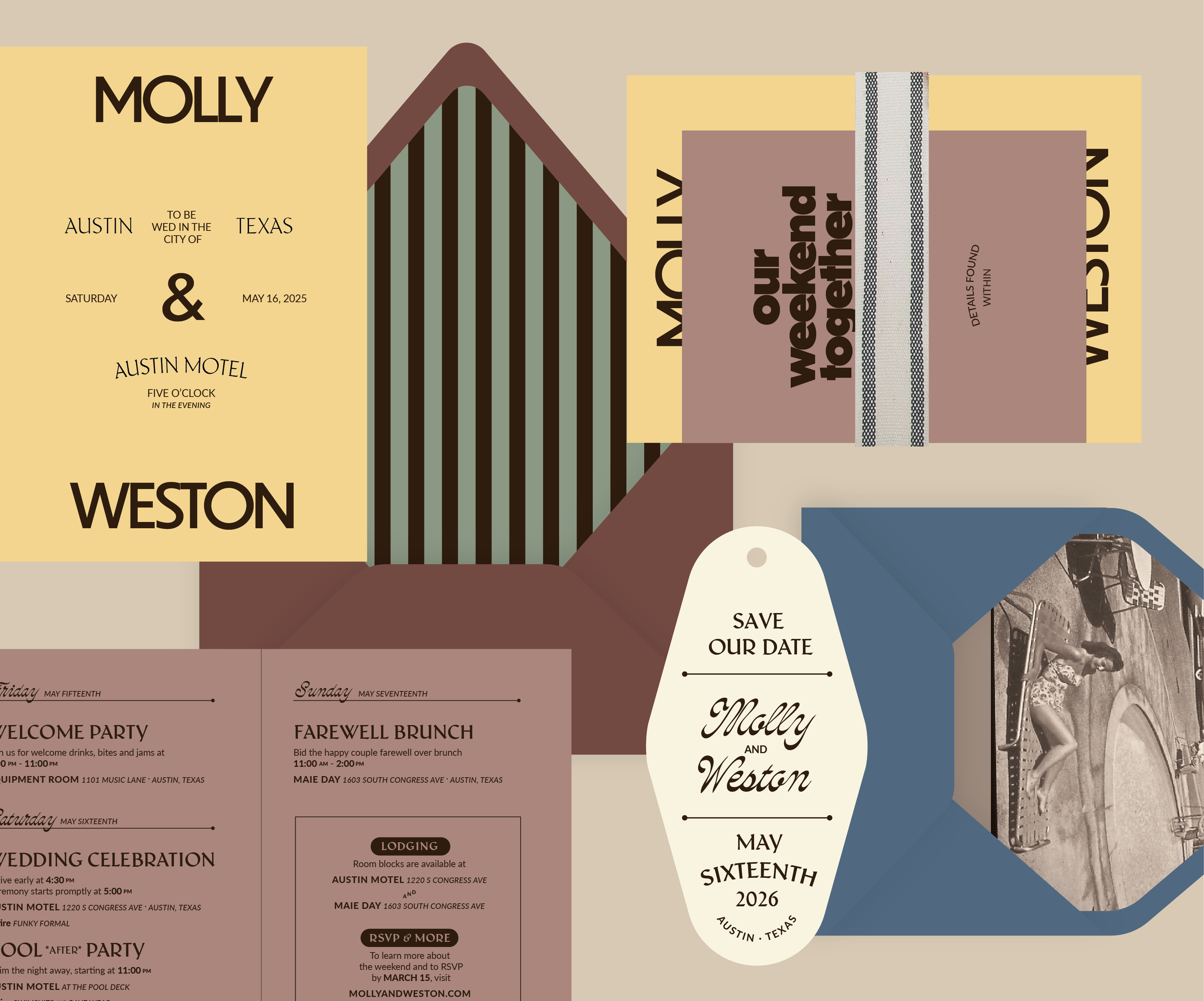 Billie is the perfect match for couple looking for a bit of retro flair. Bold stripes are accompanied by playful typography. Bonus points if you can work a vintage photo into the designs ;)