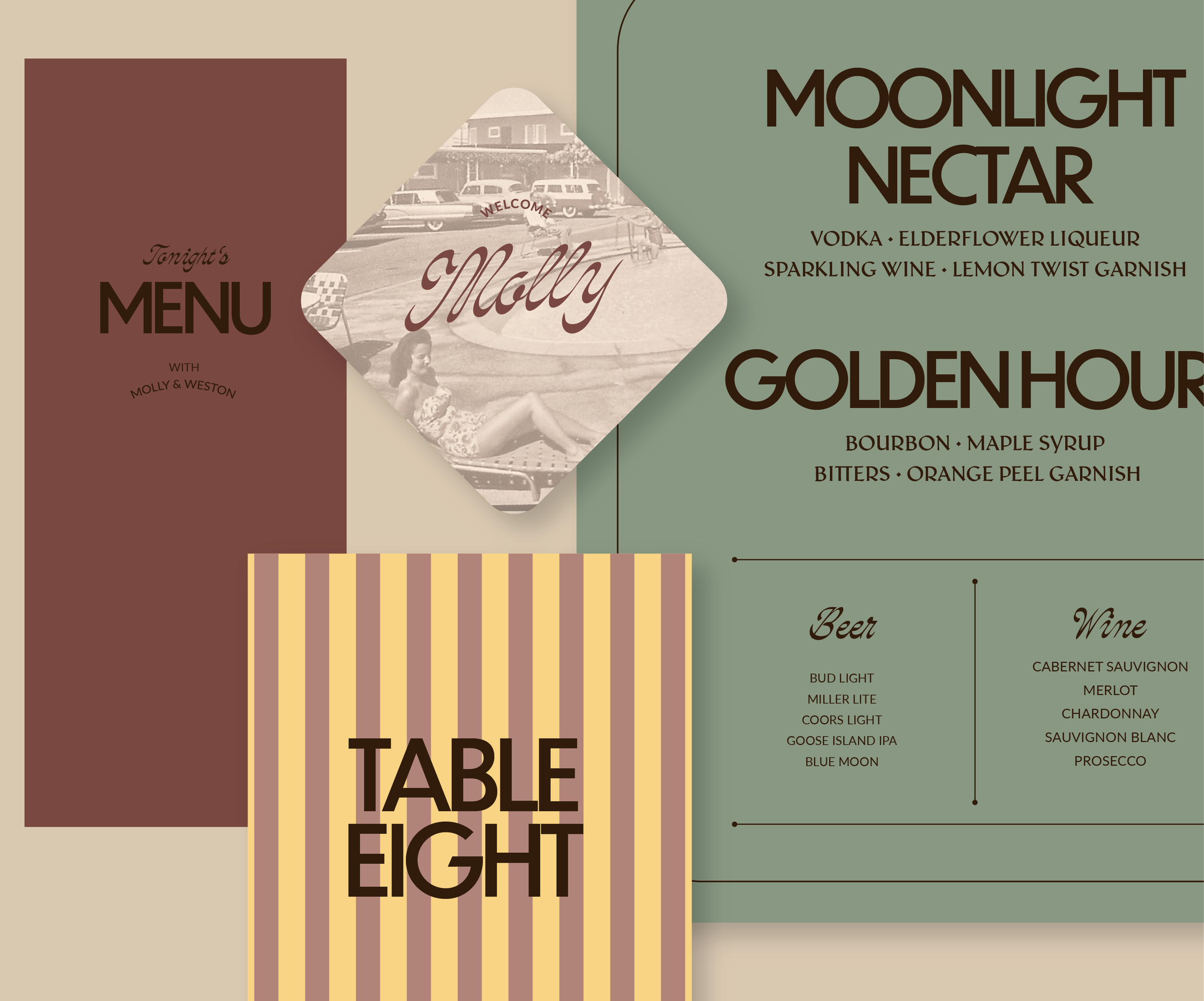 Billie is the perfect match for couple looking for a bit of retro flair. Bold stripes are accompanied by playful typography. Bonus points if you can work a vintage photo into the designs ;)