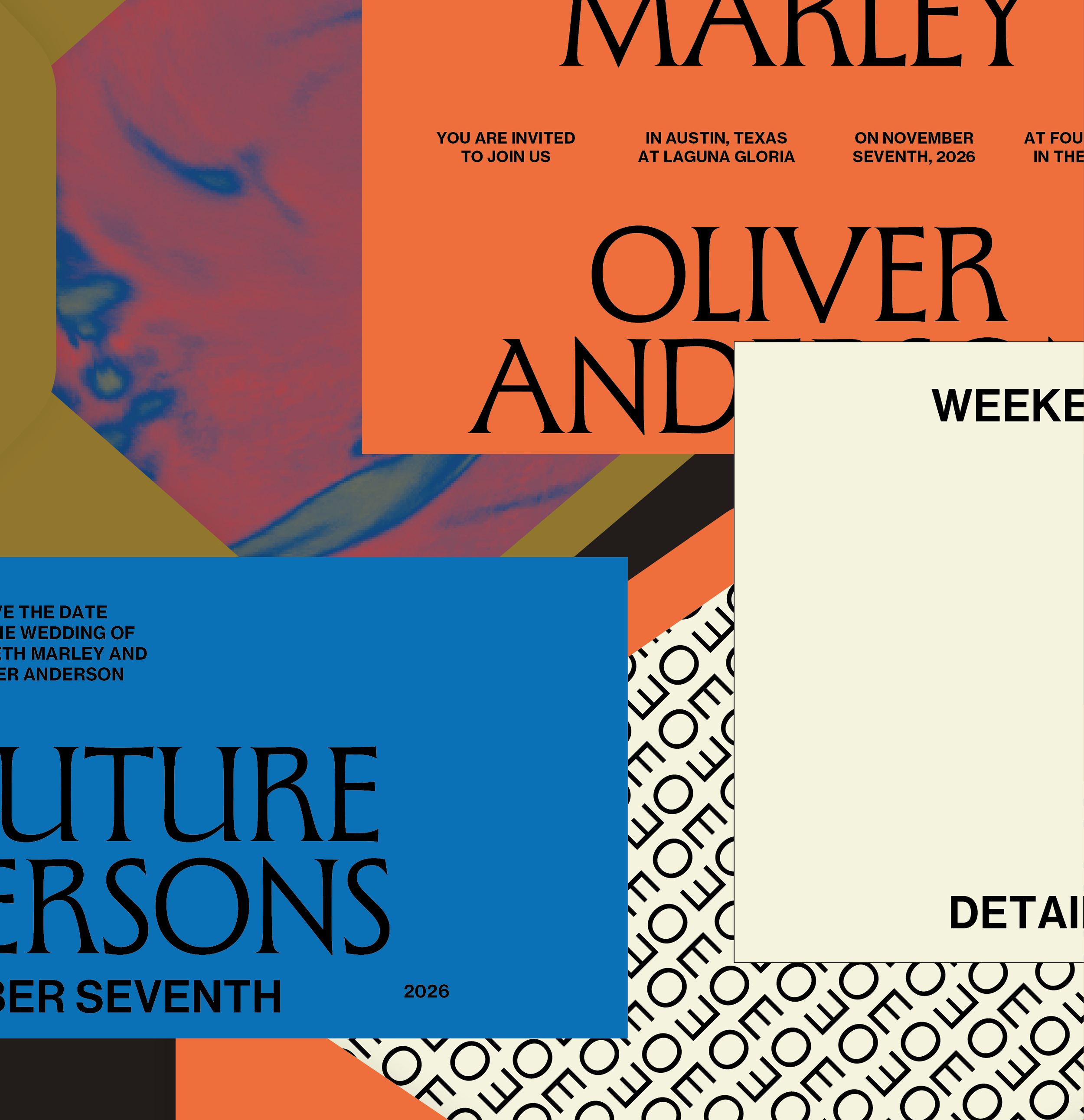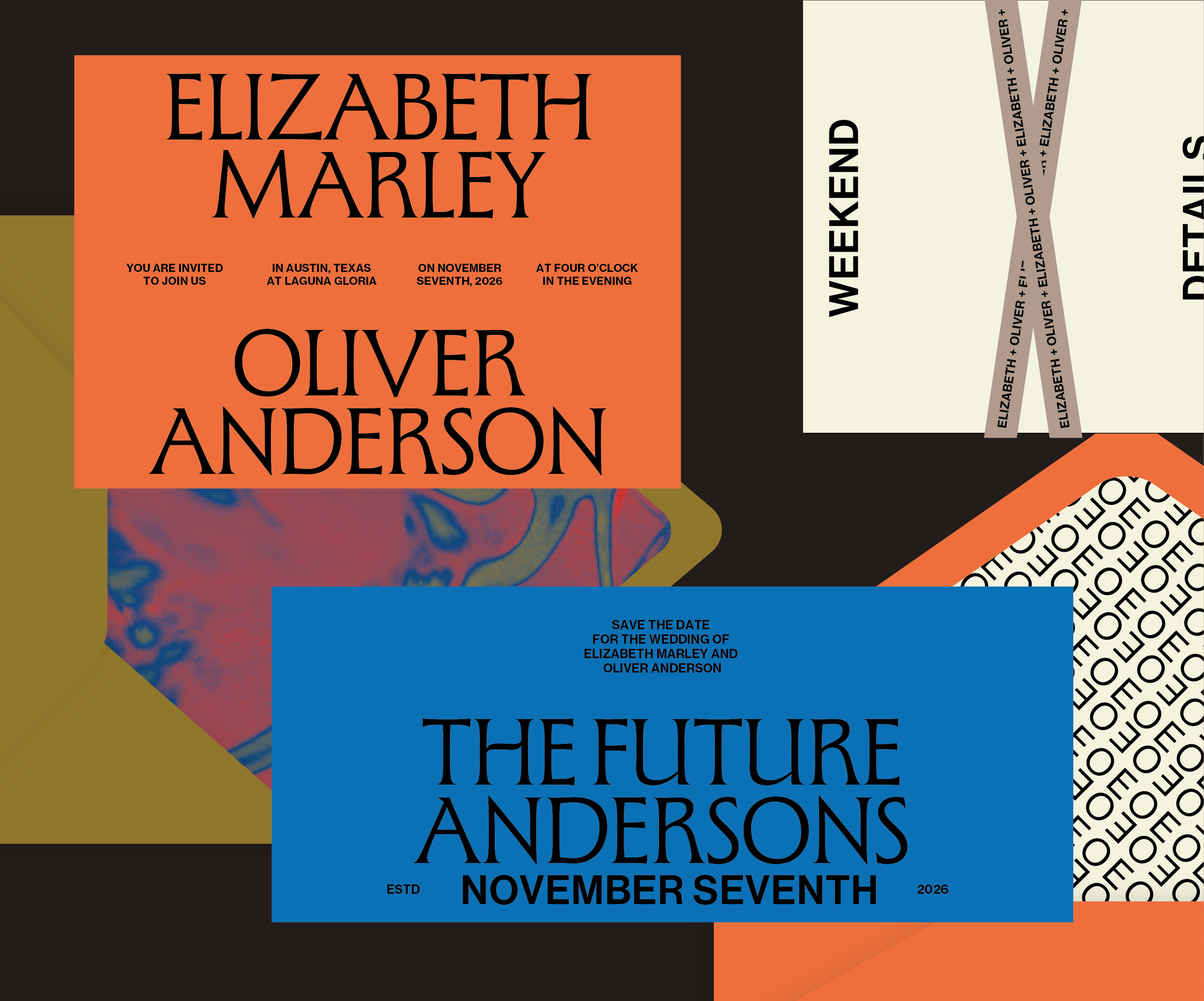 Cleo is confident and bold. She is the a great match for couples looking for a typographically focused suite, that is perfectly accented by artful textures. She looks good in just about every color.